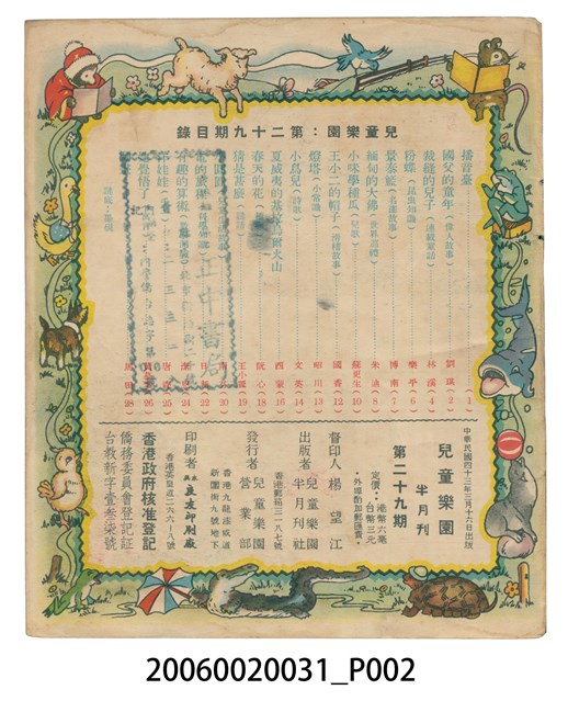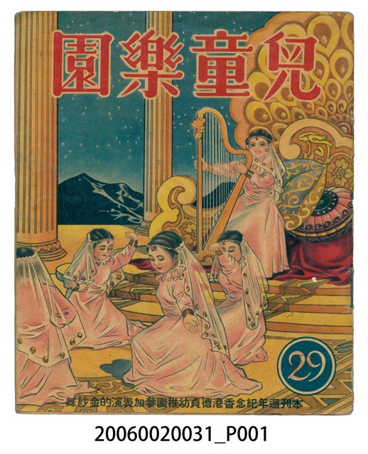 1.本件為《兒童樂園》第29期,彩色印刷,內容有偉人故事、連載童話、兒歌、滑稽故事、小常識、詩歌、兒童生活故事等等。2.《兒童樂園》創刊於1953年1月,至1995年因為經濟問題停刊,於香港共出版1006期的兒童半月刊。全書彩色印刷,內容包含歷史故事、世界童話等等,取材新穎、內容健康。