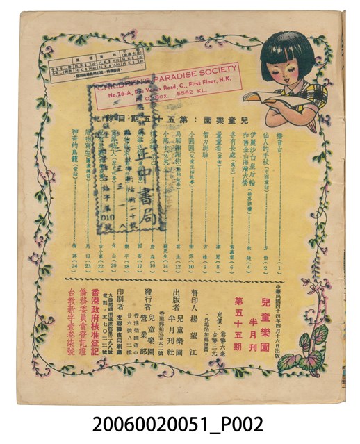 楊望江督印、兒童樂園半月刊社出版、兒童樂園營業部發行、友聯橡皮印刷廠印刷