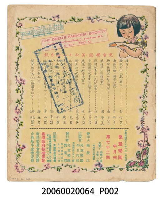 1.本件為《兒童樂園》第72期,彩色印刷,內容有寓言、科學知識、智力測驗、滑稽故事、民間故事、兒童生活故事、科學漫畫、兒歌、英國童話等等。2.《兒童樂園》創刊於1953年1月,至1995年因為經濟問題停刊,於香港共出版1006期的兒童半月刊。全書彩色印刷,內容包含歷史故事、世界童話等等,取材新穎、內容健康。