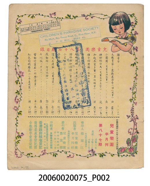 1.本件為《兒童樂園》第87期,彩色印刷,內容有偉人故事、兒童生活故事、兒童生活文藝、算術練習、植物知識、童話、中國寓言、小笑話等等。2.《兒童樂園》創刊於1953年1月,至1995年因為經濟問題停刊,於香港共出版1006期的兒童半月刊。全書彩色印刷,內容包含歷史故事、世界童話等等,取材新穎、內容健康。