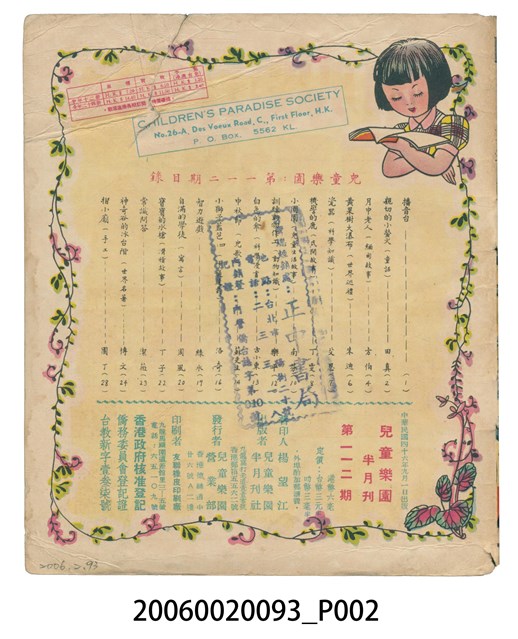 楊望江督印、兒童樂園半月刊社出版、兒童樂園營業部發行、友聯橡皮印刷廠印刷