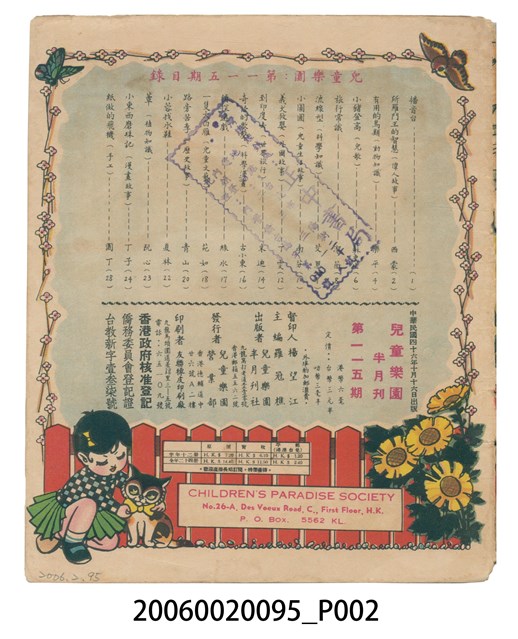 楊望江督印、羅冠樵主編、兒童樂園半月刊社出版、兒童樂園營業部發行、友聯橡皮印刷廠印刷