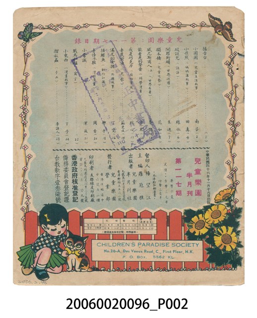 1.本件為《兒童樂園》第117期,彩色印刷,內容有兒童生活故事、媽媽講故事、謎語、世界巡禮、兒童文藝、世界名著、科學漫畫、植物常識等等。2.《兒童樂園》創刊於1953年1月,至1995年因為經濟問題停刊,於香港共出版1006期的兒童半月刊。全書彩色印刷,內容包含歷史故事、世界童話等等,取材新穎、內容健康。