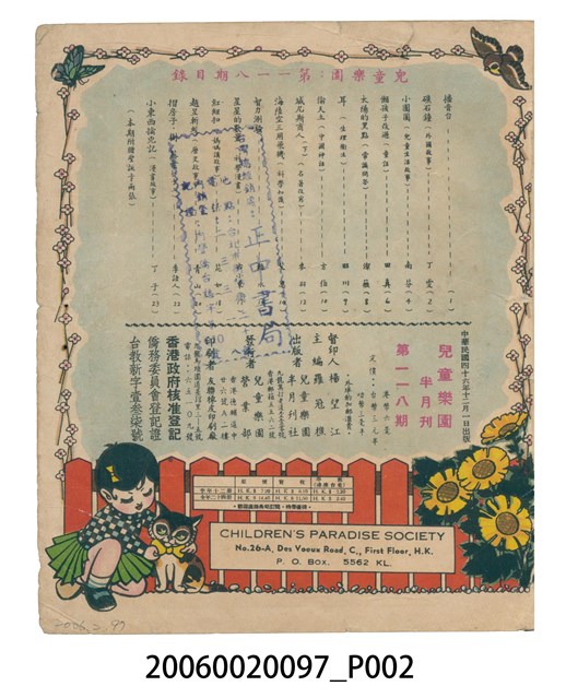 楊望江督印、羅冠樵主編、兒童樂園半月刊社出版、兒童樂園營業部發行、友聯橡皮印刷廠印刷
