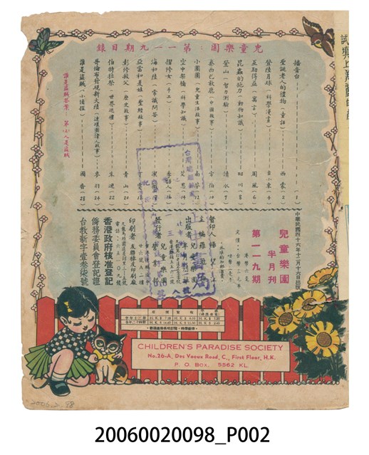 1.本件為《兒童樂園》第119期,彩色印刷,內容有童話、科學漫畫、寓言、動物知識、智力測驗、中國故事、科學知識、歷史故事、世界巡禮等等。2.《兒童樂園》創刊於1953年1月,至1995年因為經濟問題停刊,於香港共出版1006期的兒童半月刊。全書彩色印刷,內容包含歷史故事、世界童話等等,取材新穎、內容健康。