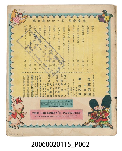 楊望江督印、羅冠樵主編、兒童樂園半月刊社出版、兒童樂園營業部發行、友聯橡皮印刷廠印刷