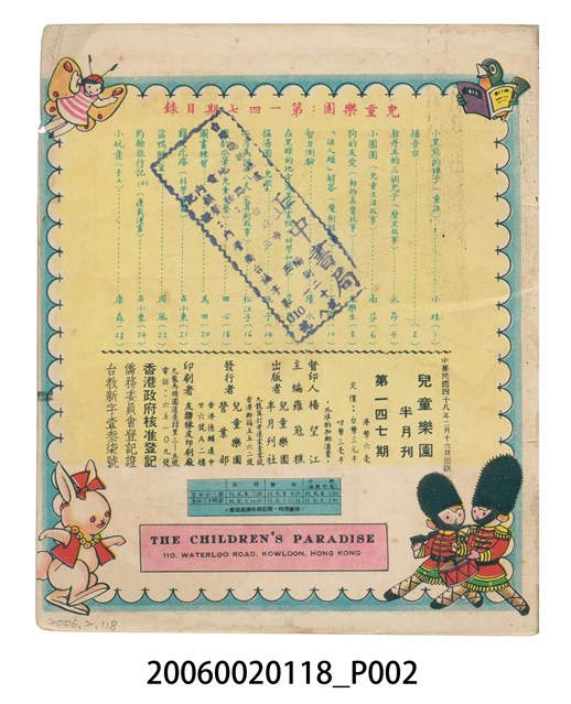 楊望江督印、羅冠樵主編、兒童樂園半月刊社出版、兒童樂園營業部發行、友聯橡皮印刷廠印刷