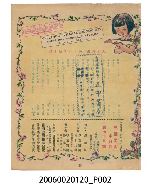 楊望江督印、羅冠樵主編、兒童樂園半月刊社出版、兒童樂園營業部發行、友聯橡皮印刷廠印刷