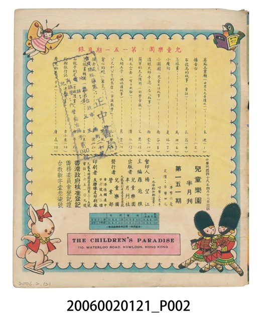 1.本件為《兒童樂園》第151期,彩色印刷,內容有童話、小魔術、兒童生活故事、名人故事、科學常識、智力測驗、常識數學、寓言、科學漫畫等等。2.《兒童樂園》創刊於1953年1月,至1995年因為經濟問題停刊,於香港共出版1006期的兒童半月刊。全書彩色印刷,內容包含歷史故事、世界童話等等,取材新穎、內容健康。53年至1995年於香港共出版1006期的兒童半月刊。