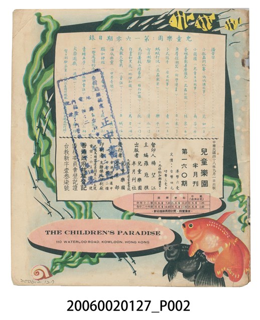 楊望江督印、羅冠樵主編、兒童樂園半月刊社出版、兒童樂園營業部發行、友聯橡皮印刷廠印刷