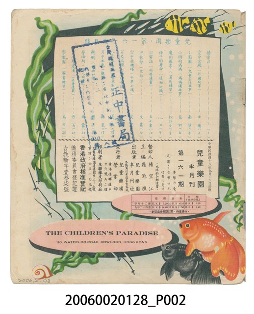 1.本件為《兒童樂園》第161期,彩色印刷,內容有外國故事、兒童生活故事、媽媽講故事、算術練習、植物知識、科學漫畫、兒歌、科學知識等等。2.《兒童樂園》創刊於1953年1月,至1995年因為經濟問題停刊,於香港共出版1006期的兒童半月刊。全書彩色印刷,內容包含歷史故事、世界童話等等,取材新穎、內容健康。53年至1995年於香港共出版1006期的兒童半月刊。