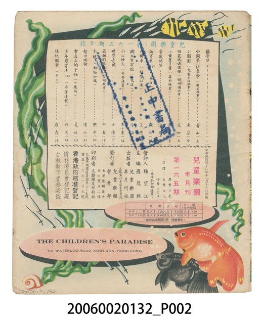 楊望江督印、羅冠樵主編、兒童樂園半月刊社出版、兒童樂園營業部發行、友聯橡皮印刷廠印刷