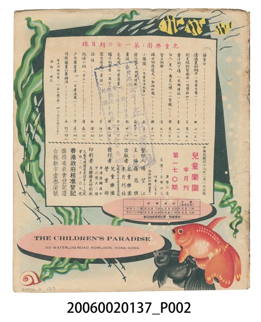 楊望江督印、羅冠樵主編、兒童樂園半月刊社出版、兒童樂園營業部發行、友聯橡皮印刷廠印刷