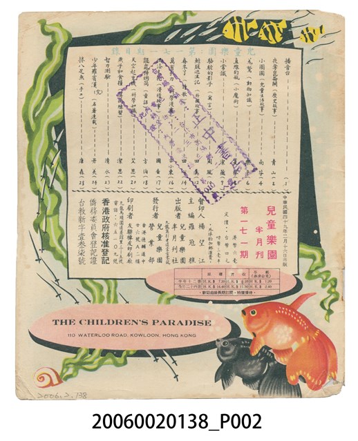楊望江督印、羅冠樵主編、兒童樂園半月刊社出版、兒童樂園營業部發行、友聯橡皮印刷廠印刷