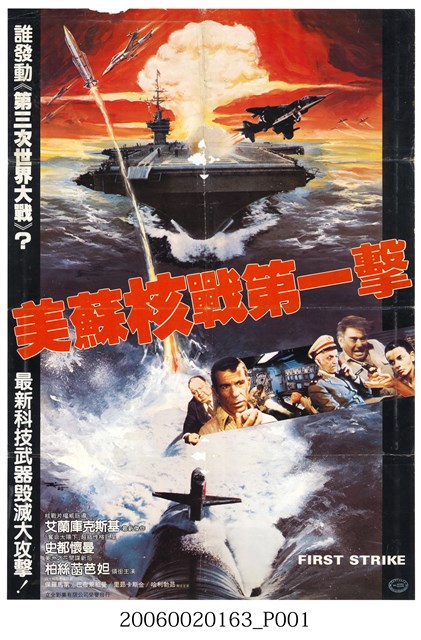 1.手繪海報大師陳子福之作,美國片《美蘇核戰第一擊》上映時的中文彩色海報,直式印刷。畫面主要呈現海軍潛艇艦在海上航行,和軍機與飛彈飛舞、船艦發生爆炸的場面,配上角色的縮小半身人像。搭配「誰發動《第三次世界大戰》?」、「最新科技武器毀滅大攻擊!」等文案字樣。海報有三折折痕;左上方有破損,中上和中下處有破洞;海報上有陳子福簽名,右下角有橢圓形章。2.《美蘇核戰第一擊》(First Strike)是1985年美國的戰爭電影,出品公司不詳,立全影業有限公司(臺灣)發行,艾蘭庫克斯基(Allan Kuskowski)執導,Dave Hanson、艾蘭庫克斯基(Allan Kuskowski)編劇,史都懷曼(Stuart Whitman)Leon Askin、Emile Beaucard主演的劇情片。
