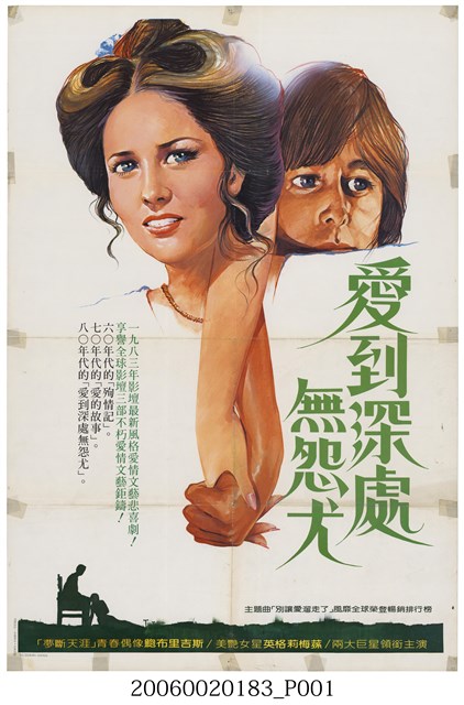 1.澳洲片《愛到深處無怨尤》上映時的中文彩色海報,直式印刷。畫面主要呈現微笑的女子與金髮男孩靠在一起的頭部特寫畫像,和手牽手的特寫。搭配「一九八三年影壇最新風格愛情文藝悲喜劇!」、「享譽全球影壇三部不朽愛情文藝鉅鑄!」、「主題曲『別讓愛溜走了』風靡全球榮登暢銷排行榜」等文案字樣。海報有兩道對稱折痕;四邊黏有小段膠帶。2.《愛到深處無怨尤》(Mutual Respect,又名Shimmering Light, Strandparty)是1978年澳洲的電視電影,由Australian Broadcasting Commission、Trans-Atlantic Enterprises聯合出品,Australian Broadcasting Commission發行,Don Chaffey執導,George Kirgo、Paul Savage編劇,鮑布里吉斯(Beau Bridges)、Lloyd Vernet Bridges、Victoria Shaw、英格莉梅蓀(Ingrid Mason)主演的劇情片。