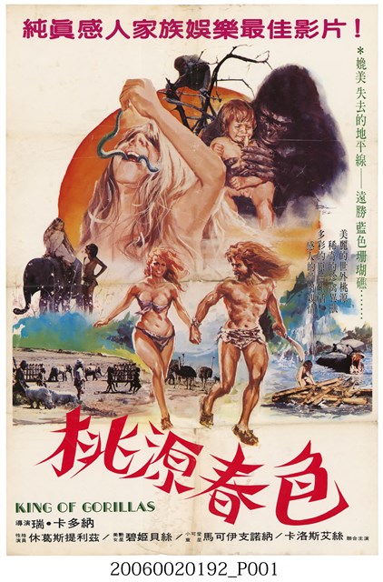1.手繪海報大師陳子福之作,墨西哥片《桃源春色》上映時的中文彩色海報,直式印刷。畫面主要呈現一對原始人打扮的男女,手牽著手向前奔跑的全身畫像,配上長髮女子吃蛇,和大猩猩抱著赤裸小孩的半身特寫畫像。搭配「純真感人家族娛樂最佳影片」、「媲美失去的地平線——遠勝藍色珊瑚礁⋯⋯」、「KING OF GORILIAS」等文案字樣。海報有兩道對稱折痕;右邊有破損。2.《桃源春色》(El rey de los gorilas)是1977年墨西哥的冒險電影,由Corporación Nacional Cinematográfica (CONACINE)、Avant Films S.A.聯合出品,ITT Contrast、World Film Magic發行,瑞卡多納(René Cardona Jr.)執導,瑞卡多納、Ramón Obón、Mario A. Zacarías編劇,休葛斯提利茲(Hugo Stiglitz)、碧姬貝絲(Peggy Bass)、Jorge Graham主演的劇情片。