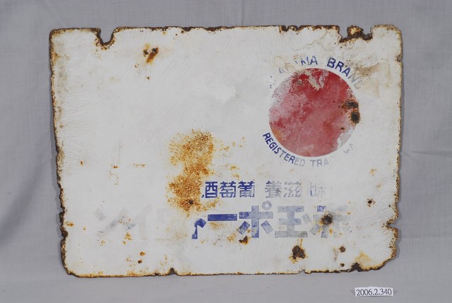1.本物件為赤玉葡萄酒鐵牌,為鐵質,呈長方形,底為白色,正面左上有紅色圓形,上下分別有「AKADAMA BRAND」、「REGISTERED TRADE MARK」深藍色字樣,正面下方有「美味 滋養 葡萄酒」、「赤玉ポートワイン」深藍色字樣,物件已嚴重鏽蝕,邊緣有破損情形,背面與正面圖案、字樣相同惟已漸模糊。