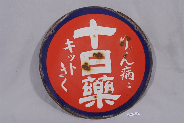 本物件為十日藥鐵牌。鐵牌為圓形,紅底白字,周圍為深藍色邊框。兩面有相同字樣。文字為十日藥、りん 病ニ、キット きく。本藥品為淋病速效藥。