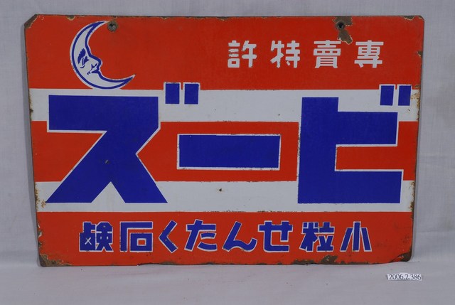 本物件為花王ビーズ廣告鐵牌,為彩色廣告鐵牌,廣告產品為花王株式會社的清潔洗劑「花王ビーズ」。右上方文字為「專賣特許」,左上方為花王的月亮商標,中央為產品名稱「ビーズ」,下方文字為「小粒せんたく石鹸」,兩面皆有相同圖案。