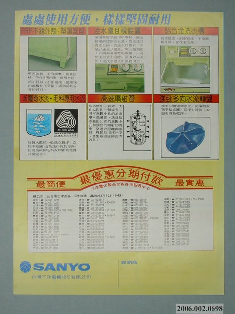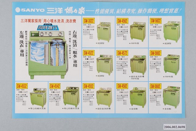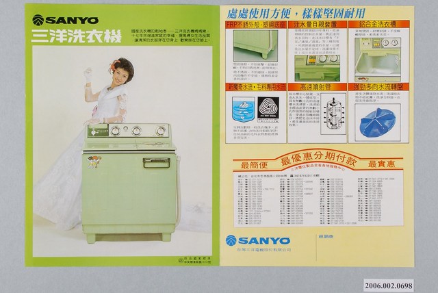 1.本物件為三洋洗衣機廣告單,紙製材質。廣告單主視覺為三洋公司洗衣機產品,廣告單正面為一穿著白紗的女性倚靠在該洗衣機產品上。廣告單背面上方為洗衣機產品特色之介紹;下方為三洋電化製品全省各地服務中心之電話。廣告單內頁為各型號洗衣機之介紹。