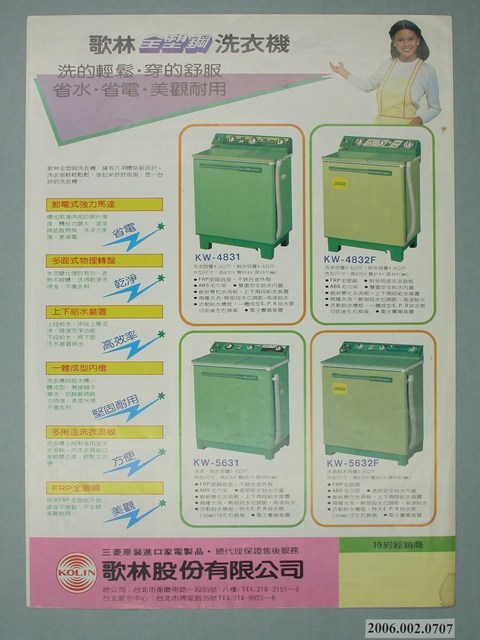 2.歌林公司由李克竣創立於西元1963年。曾與日本三菱電機技術合作生產家電。西元1984年至西元1986年間,歌林跨足生產洗衣機及除濕機。西元2010年三菱電機的臺灣子公司「臺灣三菱電機股份有限公司」結束與歌林股份有限公司之家電銷售代理關係。