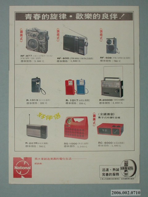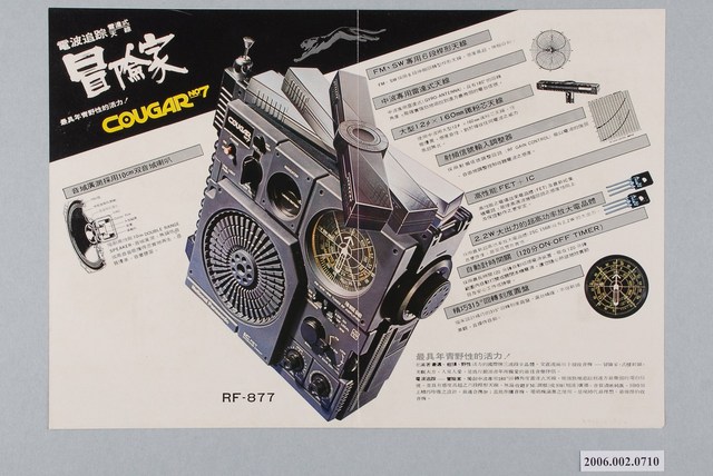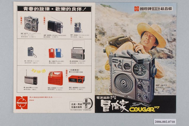 1.本物件為國際牌電晶體收音機廣告單,紙製材質。廣告單主視覺為一年輕男性登山者與該收音機產品。此產品標榜電波追蹤與雷達式天線,與廣告主視覺相符。廣告單內容為收音機產品特色與型號。