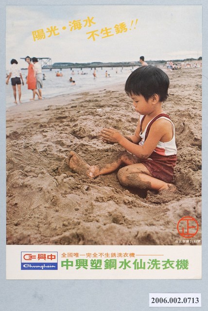 本物件為中興塑鋼水仙洗衣機廣告單,為彩色廣告單,廣告產品為中興塑鋼水仙洗衣機。封面最上方標語為「陽光,海水 不生鏽!!」,中央為1名孩子正坐在沙灘上玩沙的圖像,下方為產品名稱「中興塑鋼水仙洗衣機」與中興的商標。背後則為2種洗衣機的產品介紹與中興電工機械股份有限公司的基本資料。