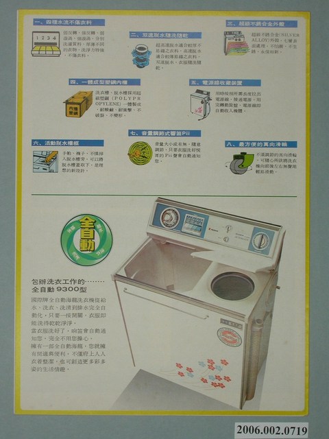 1.本物件為國際牌全能洗衣機廣告單,紙製材質。廣告單主視覺為一女童穿著海軍服樣式服裝與該洗衣機產品。廣告單內容為洗衣機產品的特色。