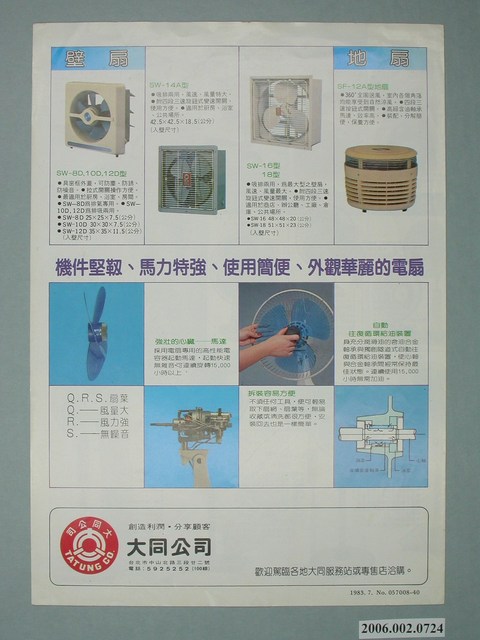 2.大同公司創立於西元1918年,創辦人為林尚志,集團總部位於臺北,公司發展由傳統製造業進展到電子相關產業,旗下包含電力設備、馬達、智慧電表、太陽能、電腦與機電、電力工程、先端電子及家電電子等8大事業體。1949年發行電扇。