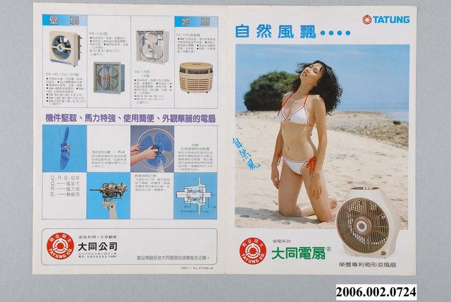 1.本物件為大同電扇廣告單,紙製材質,廣告單邊緣有皺褶現象。廣告單主視覺為一穿著兩件式泳衣年輕女性以及大同公司電扇產品。廣告單正面上方字樣為「自然風飄」;下方字樣為「省電系列」、「大同電扇」,其左側有大同公司商標。廣告單背面為電扇種類及產品特色等介紹,下方可見大同公司商標、地址及電話。廣告單內頁為各電扇種類及型號之介紹。