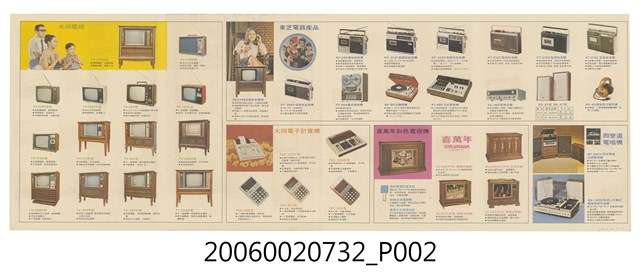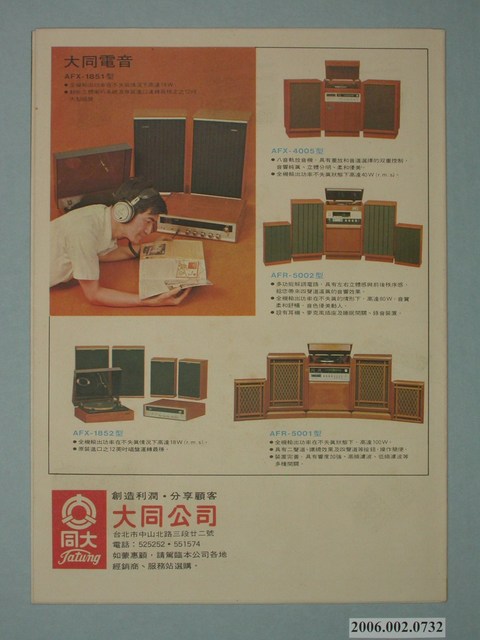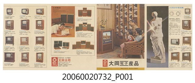 1.本物件為大同電子產品廣告單,紙質材質。廣告單上有「TATUNG」、「大同電子產品」字樣,主視覺為一對父母及其女兒一家三口,正在收看電視機,下方有標語「簡潔的分期付款:請洽各地大同服務站」,背面內容為產品型號、規格與服務站之介紹。