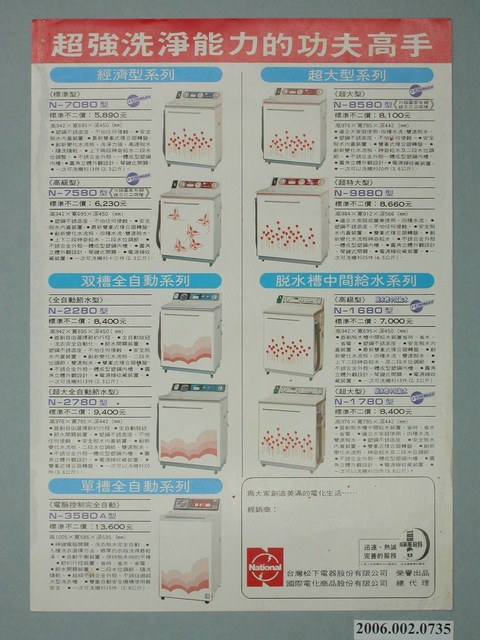 2.國際牌為台灣松下電器股份有限公司,創立於西元1962年,是Panasonic集團的一員,Panasonic集團歷史可回溯到松下幸之助於西元1918年創立的「松下家用電器製造工坊」。1967年產銷洗衣機,1971年產銷全自動洗衣機,1972