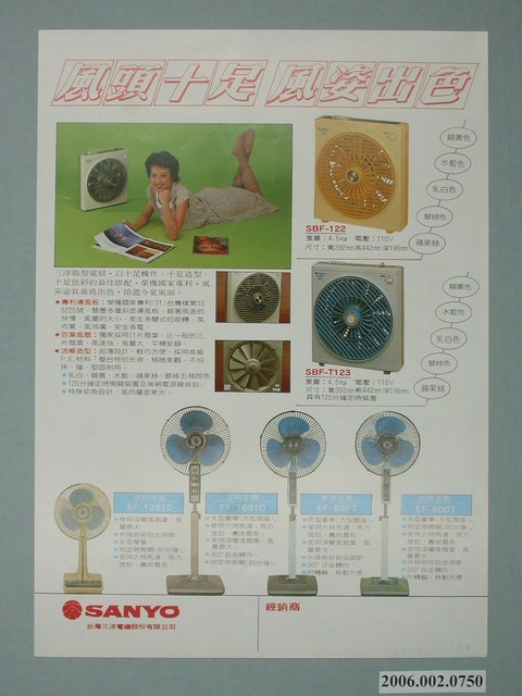 1.本物件為三洋電扇廣告單,紙製材質。廣告單主視覺為三洋公司電扇產品,廣告單正面有一文字標題為「風頭十足」,背景為一穿著白色上衣、綠色長裙的年輕女性,並擺出裙子掀飛起來,而用手遮擋的姿態。其左下方有一該電扇產品。廣告單背面為各型號風扇產品之介紹。