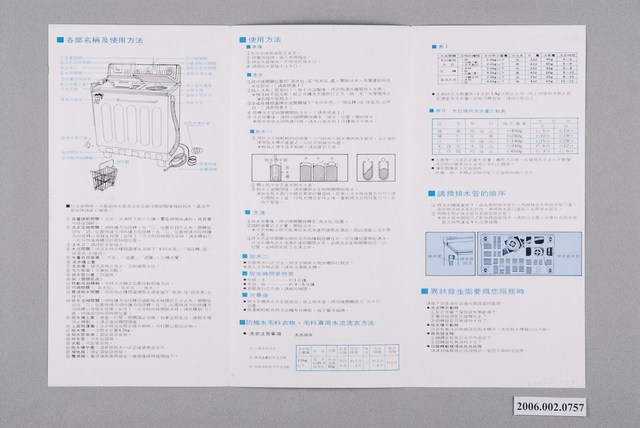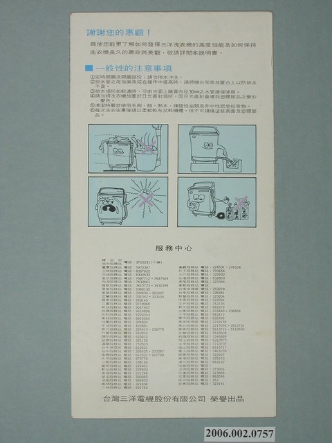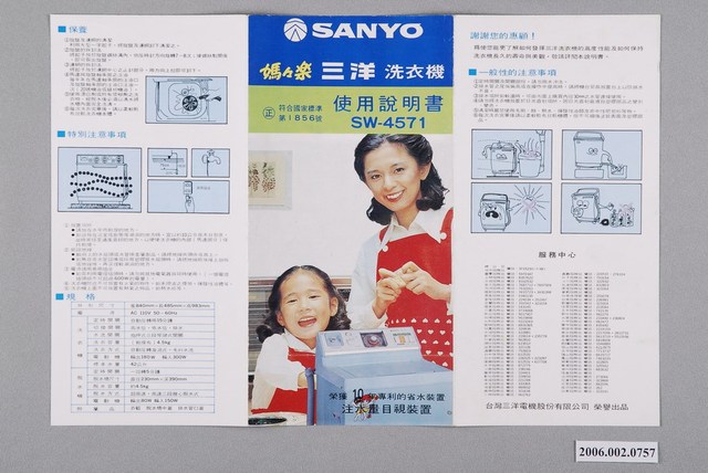 1.本物件為三洋洗衣機使用說明書,為雙面彩色列印三折頁,摺起來的封面有一位女孩及一位婦女,前方放著一台洗衣機,並有「榮獲10年專利的省水裝置注水量目視裝置」,背面則有三洋公司服務中心電話。