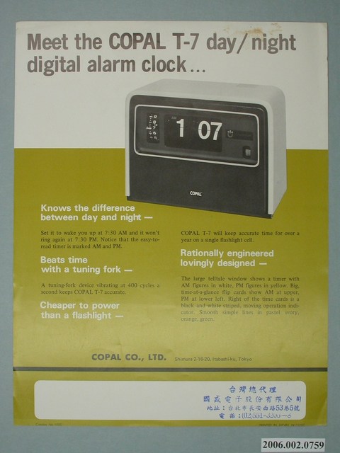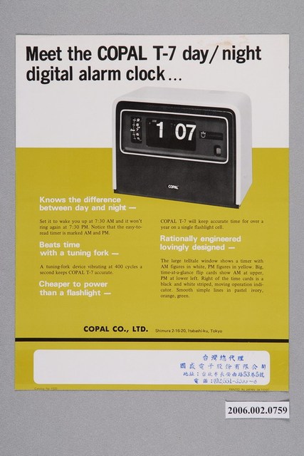 本物件為鬧鐘廣告單,為彩色廣告單,廣告產品鬧鐘,上方為產品名稱「Day-or-Night Alarm」,下方為廣告詞「Accuracy with modern decorator styling One year power on one flashlight cell」,中央是1名女子正在睡覺的畫面,左下方為產品樣貌,右下方文字為「COPAL T-7、Day/Night Digital Alarm Clock」。背後則為鬧鐘的產品介紹,右下方印有「台灣總代理、國威電子股份有限公司」的章。