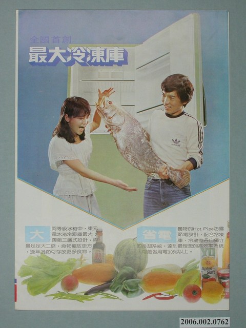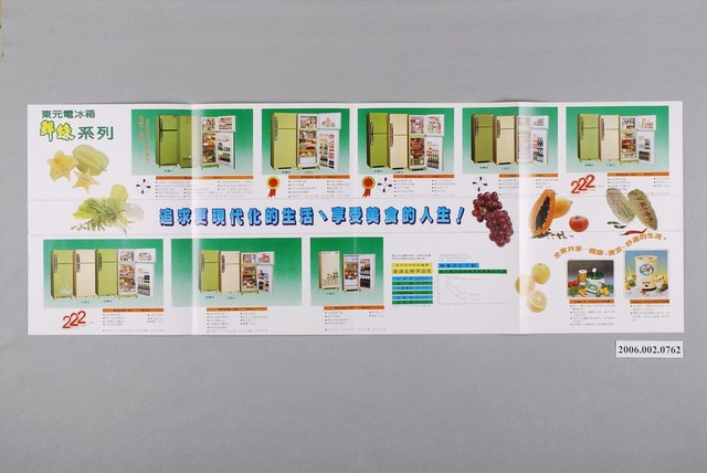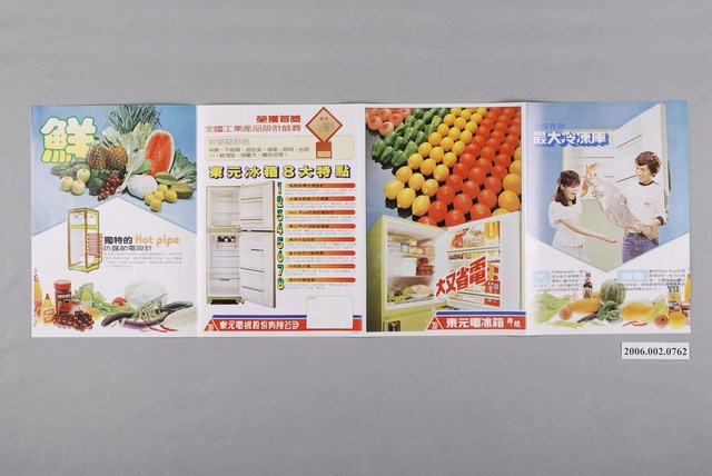 1.本物件為東元全國首創最大冷凍庫電冰箱廣告傳單,為雙面彩色列印四折頁,展開內頁介紹東元電冰箱鮮綠系列的8種機型。