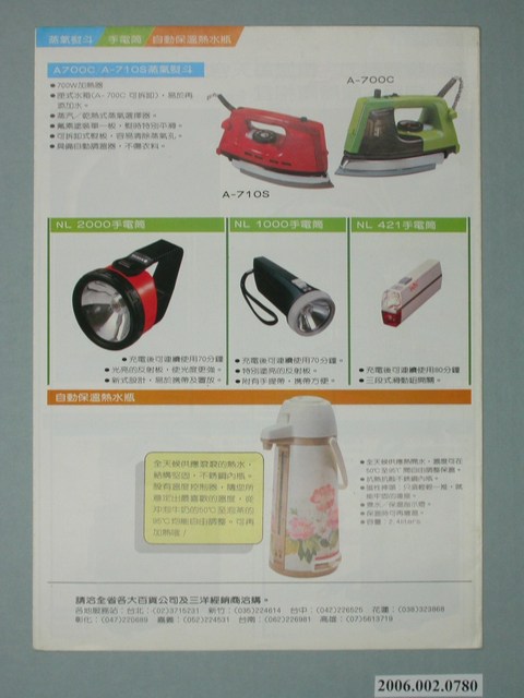 1.本物件為'83~'84三洋原裝家電系列廣告單,紙質材質。廣告單上有「SANYO」、「三洋原裝系列」、「100%整台原裝進口」字樣,主視覺為一年輕女子微笑著看著前方,前有一叢鮮花,上方有廣告詞「提升您的生活品質」,背面內容為產品型號、規格與服務站之介紹。