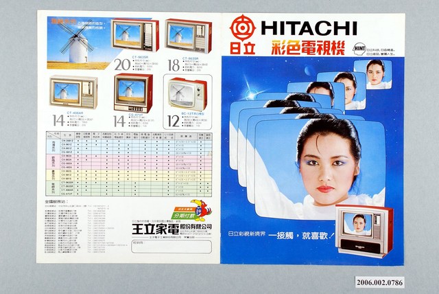 1.本物件為日立彩色電視機廣告單,紙製材質。廣告單主視覺為該電視機產品與一年輕女性照片,廣告單內容為產品型號、規格與服務站之介紹。