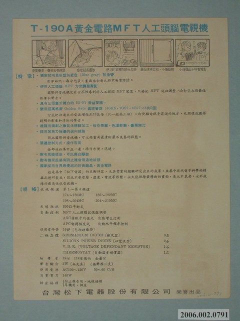 1.本物件為國際牌黃金電路人工頭腦電視機廣告單,紙製材質。廣告單主視覺為該電視機產品,廣告單內容為電視機產品特色與規格。