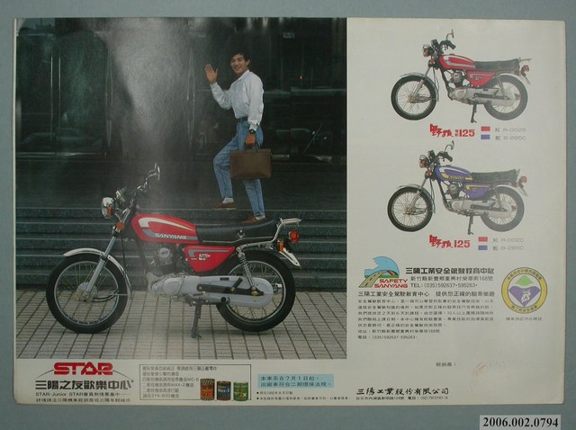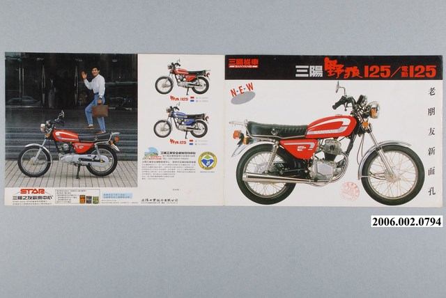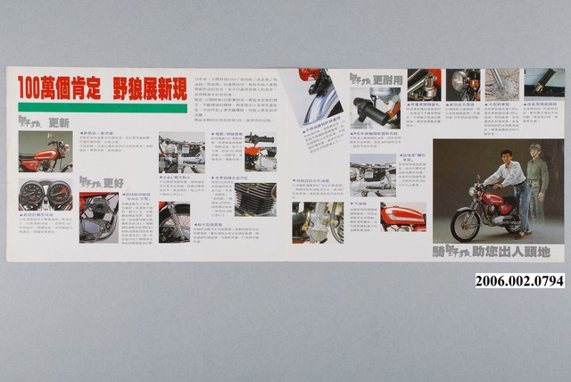 1.本物件為三陽野狼125廣告單,為彩色印刷,廣告單正面上方由左至右印有黑底紅字「三陽機車」;「三陽野狼125/電動125」,下方為1紅色野狼125,右方印有黑字「老朋友新面孔」。背面印有紅藍2款野狼125,下方印有「三陽工業安全駕駛教育中心」、「三陽之友歡樂中心」、「三陽工業股份有限公司」。