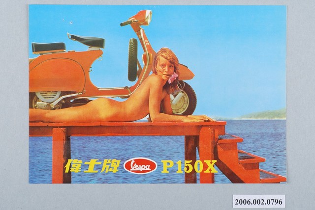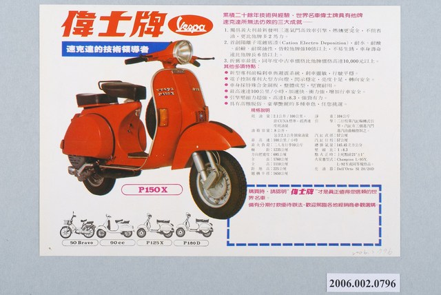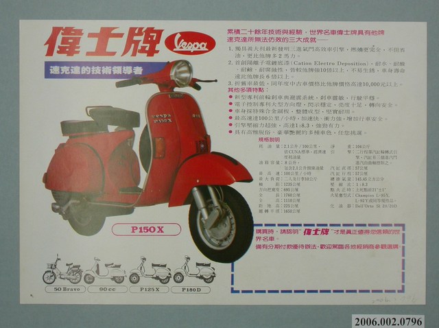 1.本物件為偉士牌P150X廣告單,廣告正面上方為紅色偉士牌與裸女,下方為黃字「偉士牌P150X」,下方中央印有紅底白字「Vespa」之商標。廣告單背面左上方印有紅字「偉士牌」,右方印有偉士牌P150X之特點與規格。