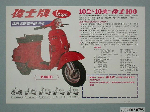 1.本物件為偉士牌P100D廣告單,廣告正面右上方為藍字「偉士牌P100D」,上方中央印有紅底白字「Vespa」之商標,右側有2名身著紅色服飾之棕髮女子,其中1名坐於摩托車上。廣告單背面左上方印有紅字「偉士牌」,右方印有偉士牌P100D之特點與規格。