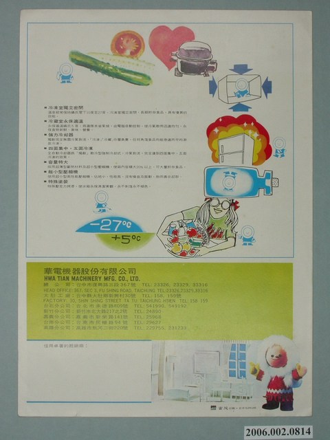 1.本物件為華電牌電冰箱廣告單,紙製材質。廣告單主視覺為一年輕女性與鮮嫩欲滴的葡萄,廣告單內容為產品特色、公司地址與電話。 2.華電機器股份有限公司位於臺中,主要開發各項家庭電器用品,如電視、冰箱、冷氣等生產,公司狀況為已解散。