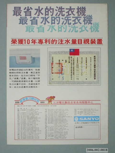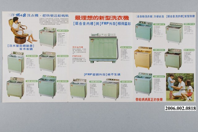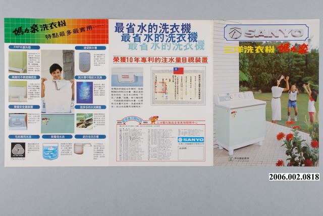 1.本物件為三洋洗衣機廣告單,共有3頁摺頁,紙製材質。廣告單主視覺為三洋公司洗衣機產品,廣告單正面有該洗衣機名稱為「媽媽樂」,背景為一穿著白色洋裝的女性,與2名孩童遊玩的畫面。廣告單另一頁面標示其為「最省水的洗衣機」,並有專利介紹、全省各地服務中心的電話與地址,以及該產品特色之介紹。廣告單內頁為各洗衣機種類、型號及特色之介紹。