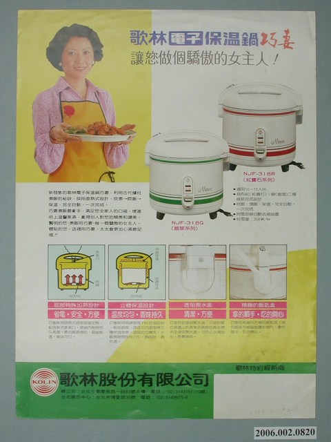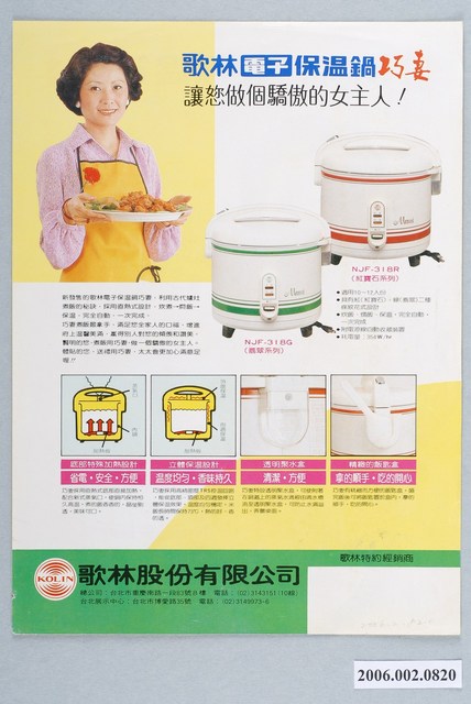 1.本物件為歌林電子保溫鍋巧妻廣告傳單,傳單為雙面彩色列印,第一面有一位身著黃色連身裙女性坐在椅子上,並寫著「滿足全家的口福是主婦的驕傲」標語,背面則介紹保溫鍋的特色及放上型號NJF-318G及NJF-318R的圖片。