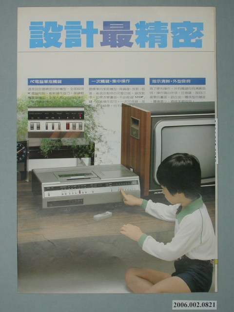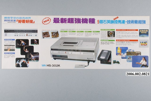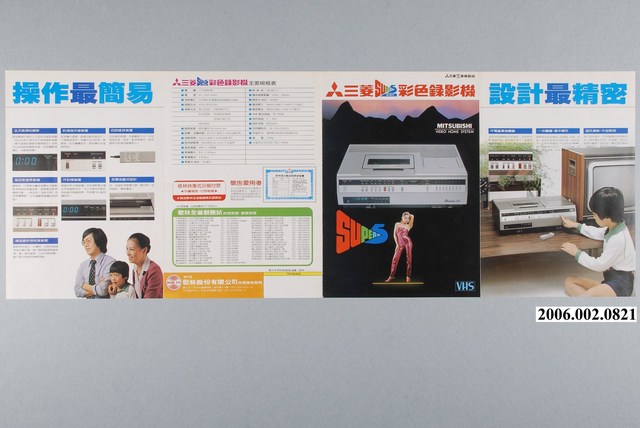 1.本物件為三菱錄影機廣告單,紙製材質。廣告單主視覺為三菱公司錄影機產品,廣告單正面下方有一打扮時尚的年輕女性。最上方可見該洗衣機名稱及三菱公司的商標。廣告單其他頁面為產品特色介紹、規格表,以及註明總代理歌林公司全省服務站之地址與電話。廣告單背面列舉多項該錄影機之產品特色。