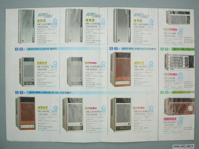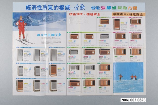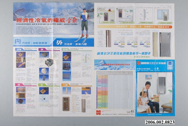 1.本物件為國際牌合歡冷氣廣告單,本物件是紙本彩色廣告單,廣告單正面標題寫有「經濟性冷氣的權威─合歡」,小標題說明特性「合歡首創除溼空調設計,省電、強、靜、健、長壽、方便,面面俱到,樣樣第一,是經濟性冷氣的權威!」在說明文的下方有附圖,分別說明「省電、強、靜、健、長壽、方便」六種冷氣的構造特性;廣告單的背面是以一個穿著滑雪服裝的人,站立在冰凍的雪山中,面帶微笑,表達出該冷氣廣告的意象,並且附上圖文展示各種冷氣的機型、型號、適合坪數、搭配何種需求等等。此廣告是由「台湾松下電器股份有限公司」出品。