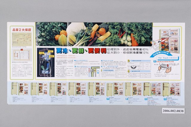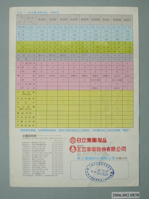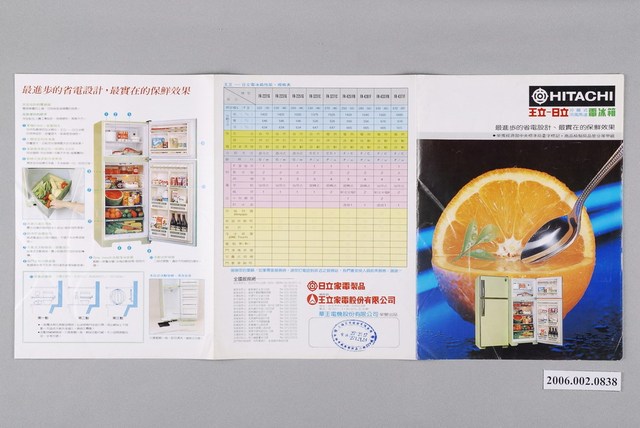 1.本物件為日立電冰箱廣告單,紙製材質。廣告單主視覺為該電冰箱產品與鮮嫩欲滴的柳橙背景,廣告單內容為產品特色、規格與服務站之介紹。