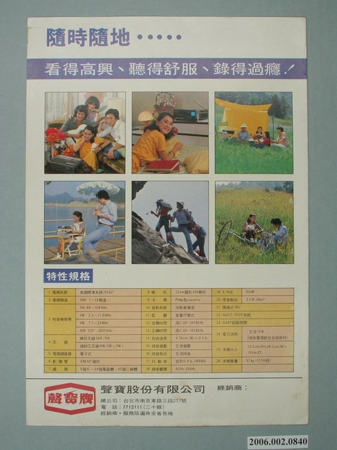 1.本物件為聲寶牌電視收音錄音機看聽錄字樣廣告傳單,第一面上半部為藍天白雲的圖樣,中間寫著「看聽錄」及「TELECASSE」字樣,下方則是型號TR-360收錄音機圖樣,背面上方有「隨時隨地.....看得高興、聽得舒服、錄得過癮!」字樣,中間有6張照片,下方則介紹其特性規格。